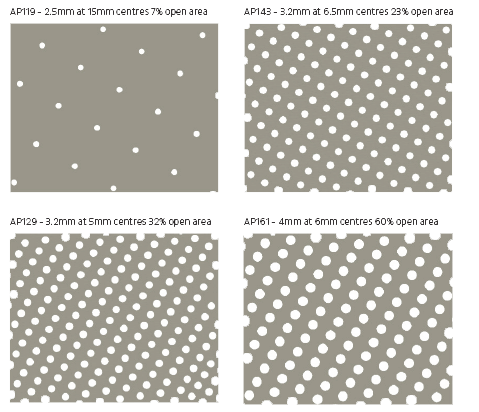 Perforations are available in four holes sizes and array pitches giving open areas of 7% to 60%. Examples are shown below:
